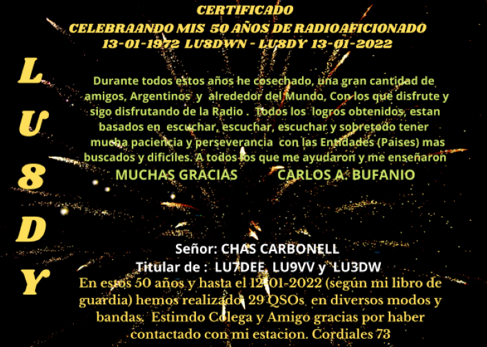 Resumiendo, gracias totales a todos quienes me acompañaron y permitieron que los acompañe en estos, mis primeros 50 años en la radioafición.