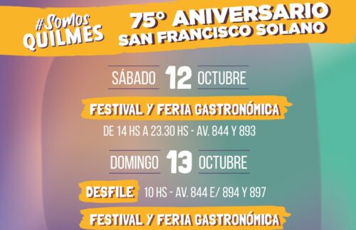 El Municipio invita a los vecinos y a las vecinas a participar de la celebración por el 75º aniversario de Solano, que el sábado 12 contará con un festival y una feria gastronómica desde las 13; mientras que el domingo 13, desde las 10, comenzará el desfile cívico tradicionalista; y habrá shows musicales a partir de las 17:30, con la presencia de Los Manseros Santiagueños de Leocadio Torres, Siete Lunas y Silvana Galli Carabajal, entre otros.
