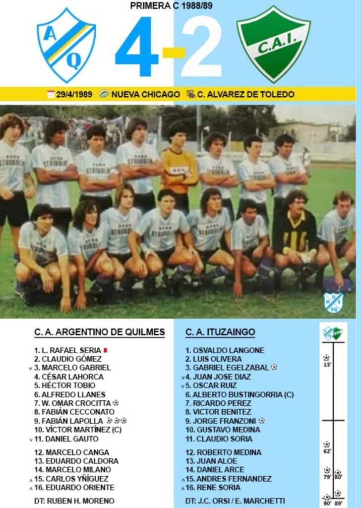 El 29 de abril de 1989 en la cancha de Nueva Chicago se jugó el desempate. Fue la gran final por el ascenso a la Primera B Metropolitana entre Argentino de Quilmes e Ituzaingó, con el triunfo del Mate 4 a 2 (con tres goles de Fabián Lapolla -uno de penal- y Walter Omar Crocitta para el ganador; y Elguezábal y Franzoni para el León).