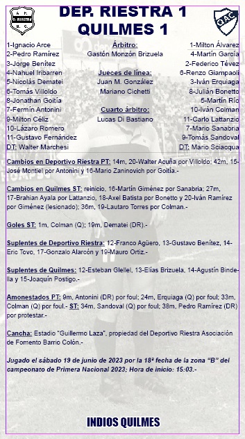 Fue un primer tiempo para el olvido, donde Quilmes ni siquiera insinuó. Riestra apenas si tuvo un remate en el travesaño y un cabezazo de Céliz que se fue cerca. El juez Gastón Monzón Brizuela no vio una clara mano de un defensor local en el área propia, lo que podría haber torcido la historia. En este tiempo vieron la amarilla Erquiaga y Colman.