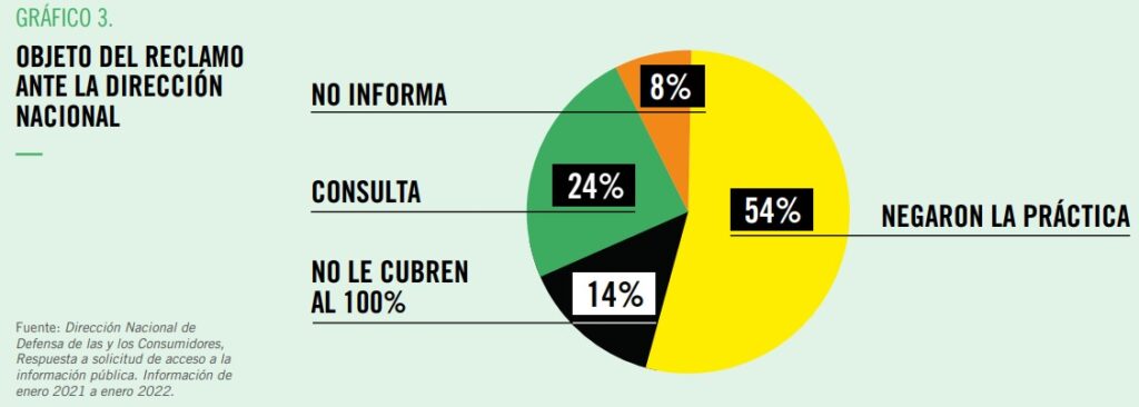 Según la Dirección de Defensa de Consumidores, resolvieron un tercio de los casos recibidos. La mitad del total los derivó al Ministerio de Salud de la Nación. “Se desconoce el resultado de la intervención del porcentaje restante”, dice AI, como tampoco cuántas personas con cobertura debieron ir a hospitales.