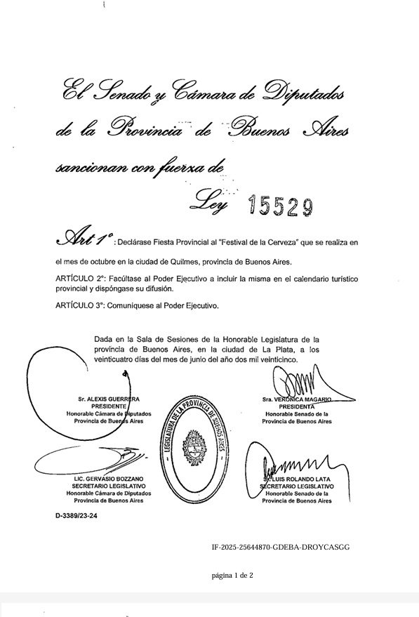 Luego de girar por comisiones y obtener el voto afirmativo de todos los diputados presentes, el proyecto giró al Senado, donde hoy se tratamiento. Tras una breve reseña, todos los senadores presentes dieron su voto afirmativo y quedaron convertidos en ley los dos ítems: Quilmes es la capital provincial de la cerveza y el 31 de octubre es el día de la fiesta provincial a realizarse en el distrito. El motivo de la elección de esa fecha es porque la cervecería fundada por Otto Bemberg produjo el primer chopp esa jornada pero de 1890 y se empezó a vender el dorado líquido que distingue a la ciudad de Quilmes hace casi 135 años.