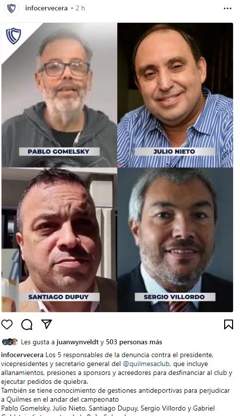 Respecto al denunciante, que se mantiene de manera anónima, afirmó que «es una persona conocida del mundo Quilmes, un denunciante serial que no tiene ningún tipo de conocimiento del club. «Anti-Quilmes» que no quieren al club y buscan de alguna forma quitar la posibilidad de ascenso. Todos saben quién es».