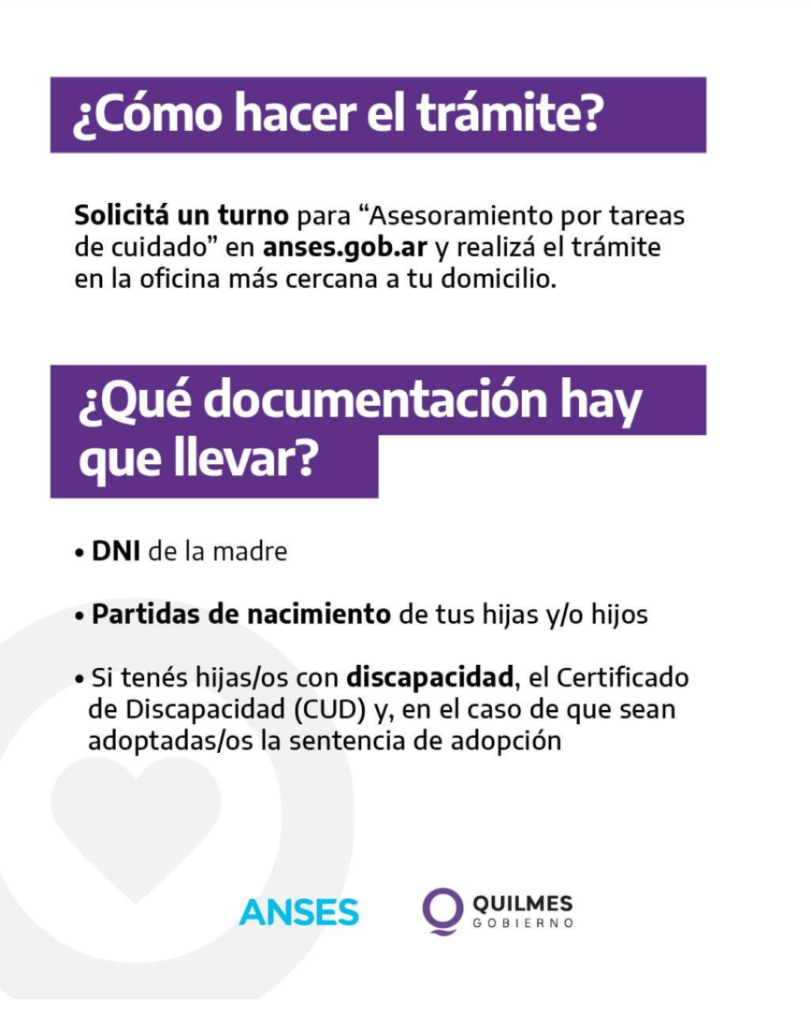 Desde este 2 de agosto y hasta el 13, de lunes a viernes de 8.30 a 14, se desarrollará un operativo especial para el ingreso al Programa Integral de Reconocimiento de Períodos de Aporte por Tareas de Cuidado, impulsado por la ANSES, en el Polideportivo Municipal Reinaldo Gorno, ubicado en Vicente López y Lafinur, Quilmes Oeste, con acceso a 120 turnos adicionales por día (se suspende por lluvia).