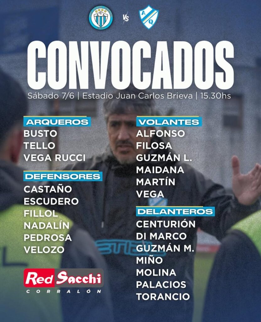 Para este viaje a Merlo Norte, los convocados por Cristian Grabinski son: Busto, Tello y Vega Rucci; Castaño, Escudero, Fillol, Nadalin, Pedrosa y Velozo; Alfonso, Filosa, Leandro Guzmán, Maidana, Martín y Vega; Torancio, Centurión, Di Marco, Maximo Guzmán, Miño, Molina y Palacios. Hay muchas nombres pocos vistos en las últimas jornadas y nuevos son los que se ven, pero con un notable sentido de pertenencia para con la camiseta celeste y blanca y ganas de revertir la situación.