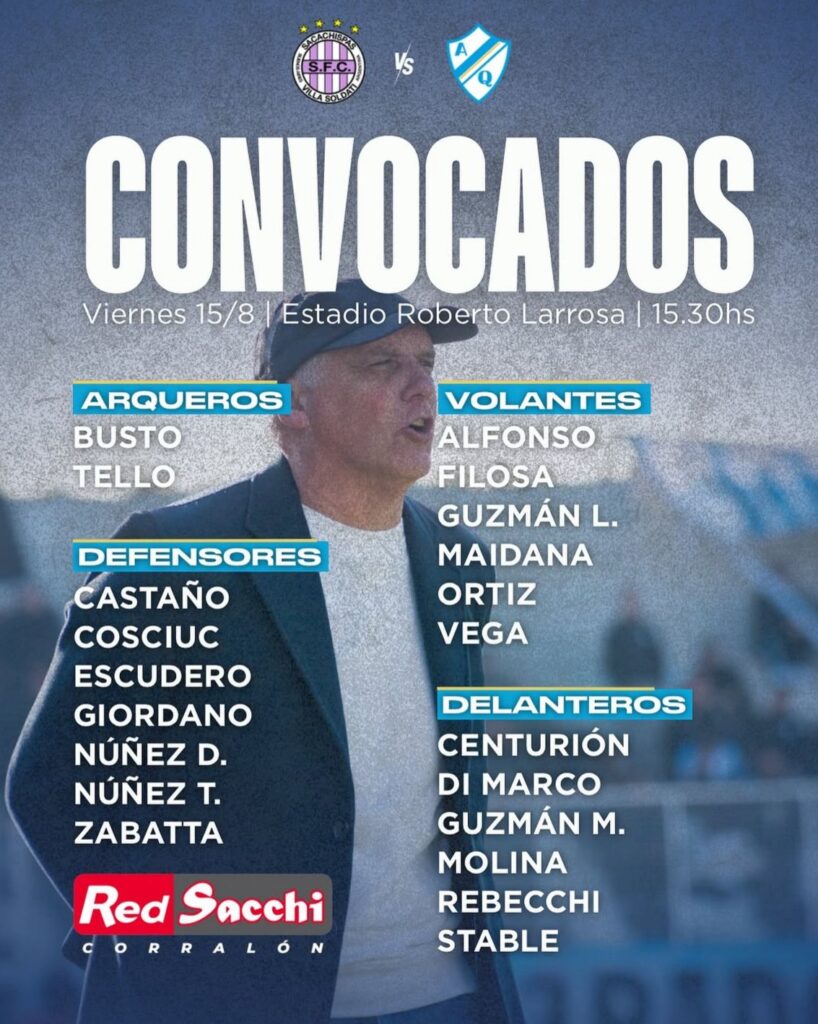 La convocatoria frente al conjunto de Villa Soldati la conforman Tello, Busto; Castaño, Cosciuc, Escudero, Giordano, Núñez T., Núñez D., Zabatta; Alfonso, Filosa, Guzmán L., Maidana, Ortiz, Vega; Centurión, Di Marco, Guzmán M., Molina, Rebecchi y Stable. En los ausentes están Geronimo Velozo que ya la fecha que viene estará disponible y Elías Torancio que sigue en recuperación. Por el otro lado, Leandro Guzmán regresa al igual que Alan Ortiz y Fernando Cosciuc.