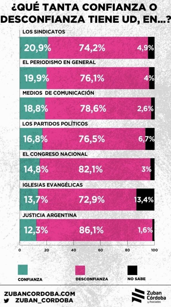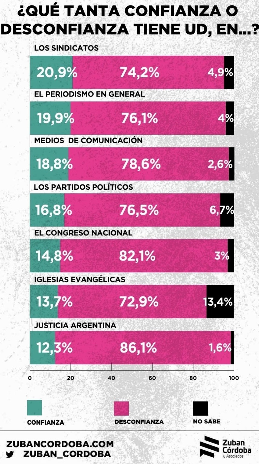 El periodismo, considerado el cuarto poder, tiene una desconfianza del 76, 1% ¿será porque hay periodistas que se comportan como militantes?, pero el público debe saber que también los hay independientes, mendigando por una miserable pauta publicitaria. Pareciera que debemos ser santos y trabajar gratis. Los medios de comunicación están en manos de unos pocos, lo que convierte al comunicador en un mero títere del medio al que pertenece, es decir «pensar, escribir y comunicar» al ritmo político del momento.
