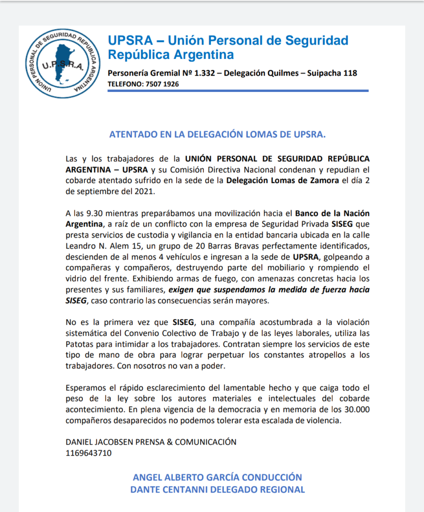 Desde UPSRA Quilmes, la Unión Personal de Seguridad de Argentina, informan de un violento ingreso de una patota a su sede de Lomas.