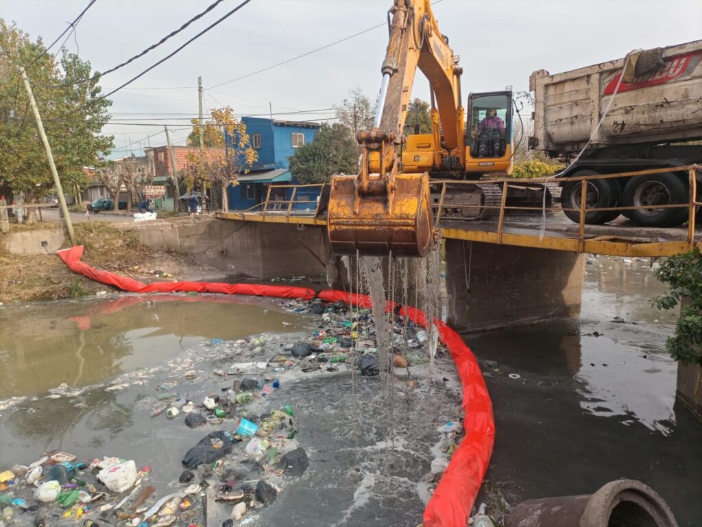 Por otra parte, con camiones, bateas y maquinaria pesada, continúan los trabajos diarios de limpieza en el arroyo Las Piedras, en este caso, en su cruce con la calle Catamarca, en Quilmes Oeste.