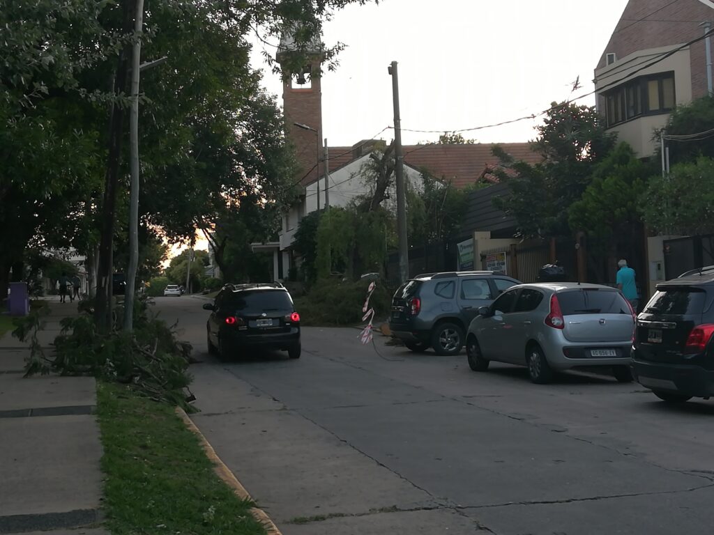 Vecinos refieren que desde la tormenta última se encuentran estos cables en medio de la calle, suponen que arrastrados por ramas de árboles que el viento arrancó. La empresa de telefonía hizo un enganche provisorio que duró horas, y colocó unas cintas de precaución que apenas pueden verse al atardecer.