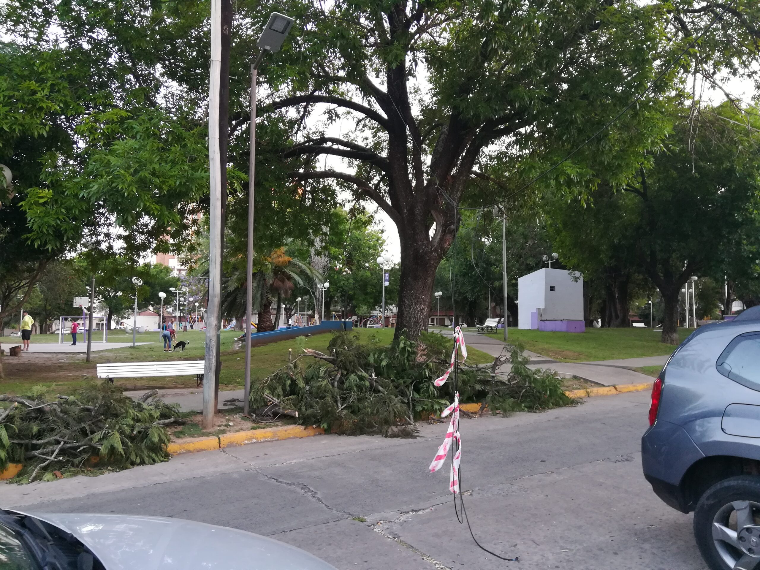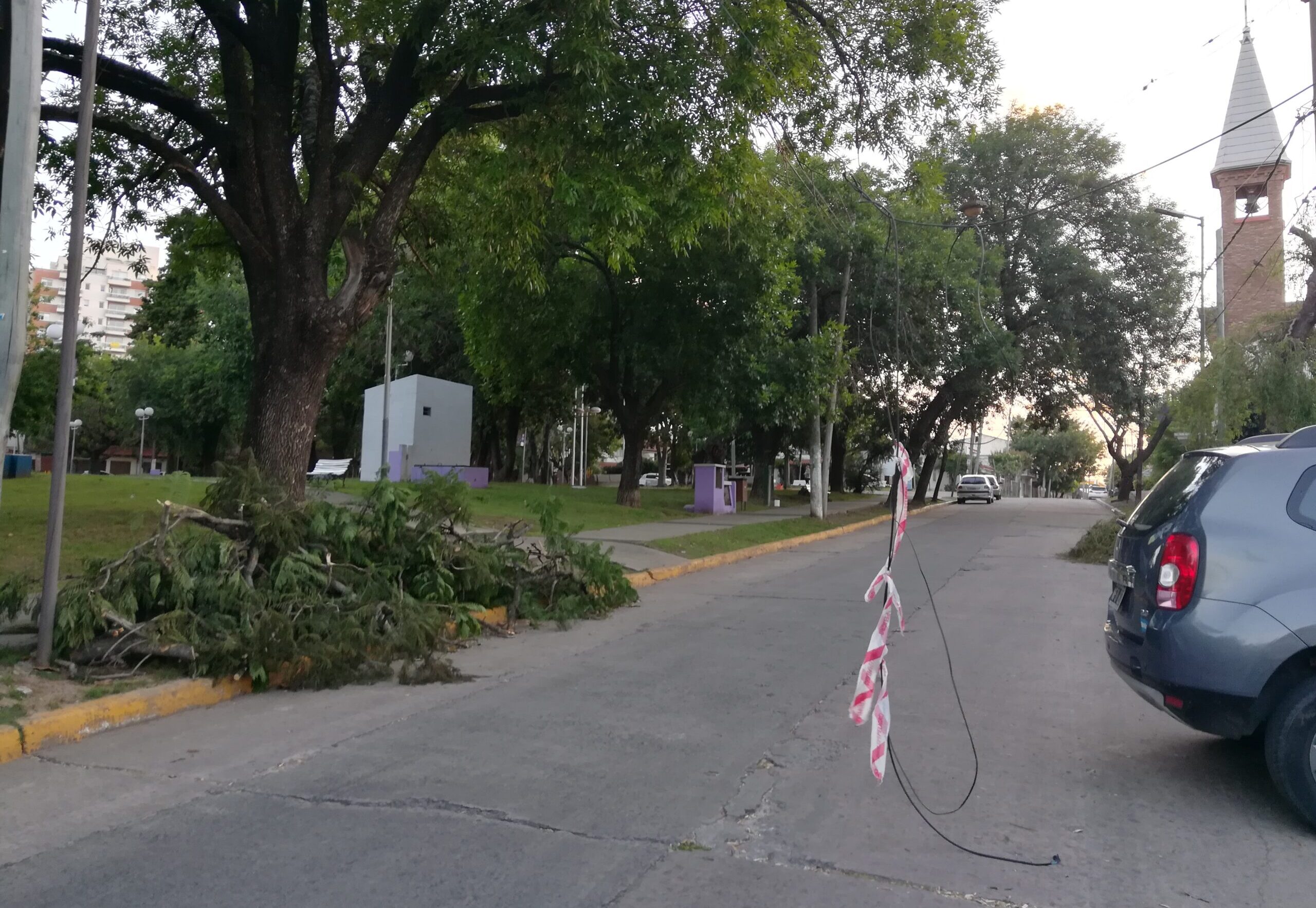 Vecinos refieren que desde la tormenta última se encuentran estos cables en medio de la calle, suponen que arrastrados por ramas de árboles que el viento arrancó. La empresa de telefonía hizo un enganche provisorio que duró horas, y colocó unas cintas de precaución que apenas pueden verse al atardecer.