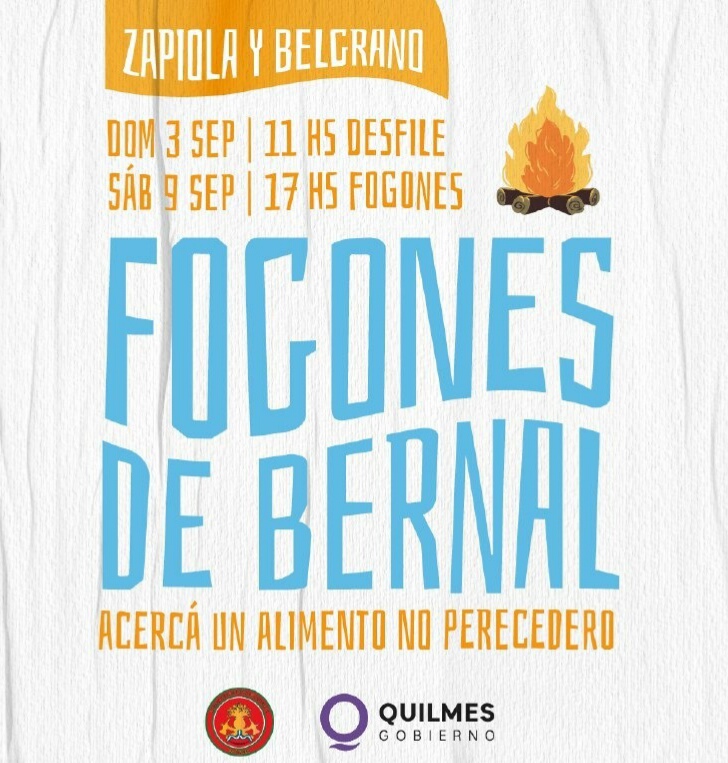 El sábado 9 de septiembre, a partir de las 17 y hasta las 23, será el turno de la quincuagésimo sexta edición de los Fogones de Bernal, que nuevamente serán organizados por los Bomberos de Bernal, con el apoyo de la Municipalidad de Quilmes, y se desarrollarán sobre las avenidas Zapiola entre Rawson y 26 de Julio, y Belgrano desde Liniers hasta Don Bosco. Allí, se podrán disfrutar de más de 50 puestos de comida típica, artesanías, juegos y espectáculos artísticos de diversos géneros.