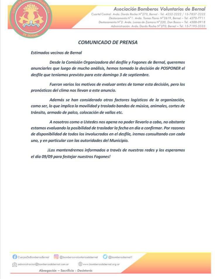 Con motivo de las celebraciones por los 63 años de la declaración de Bernal como ciudad, se viene este domingo el desfile cívico tradicionalista, y el fin de semana siguiente, los emblemáticos fogones, en los que la comuna acompaña a la organización que encabezan los Bomberos Voluntarios e instituciones locales.