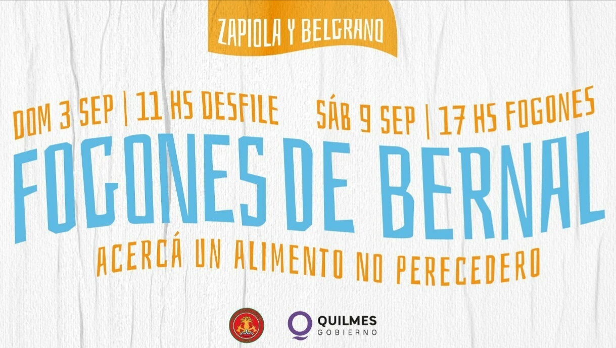 El sábado 9 de septiembre, a partir de las 17 y hasta las 23, será el turno de la quincuagésimo sexta edición de los Fogones de Bernal, que nuevamente serán organizados por los Bomberos de Bernal, con el apoyo de la Municipalidad de Quilmes, y se desarrollarán sobre las avenidas Zapiola entre Rawson y 26 de Julio, y Belgrano desde Liniers hasta Don Bosco. Allí, se podrán disfrutar de más de 50 puestos de comida típica, artesanías, juegos y espectáculos artísticos de diversos géneros.