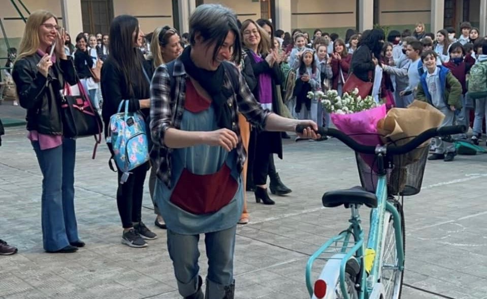 A la «seño Luján», del Colegio San José, le robaron su bicicleta mientras daba clases. Como era su único medio de transporte, la comunidad educativa se esmeró en comprarle una nueva. «Se lo merece porque es una excelente docente», señalaron. Ella lloraba de felicidad y emoción.