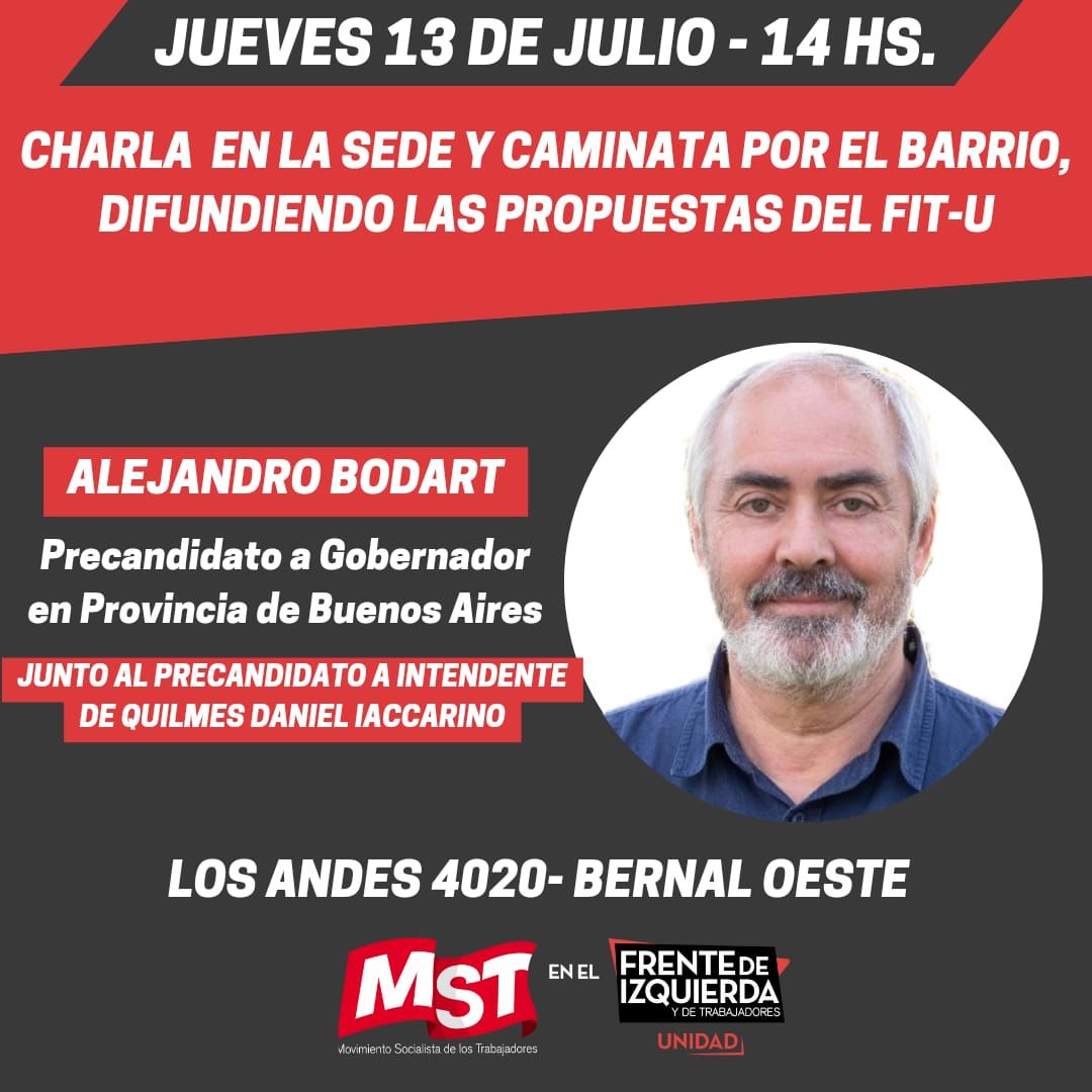 Este jueves 13 desde las 14 se realizará una charla junto al precandidato a gobernador, Alejandro Bodart, y al precandidato a Intendente, Daniel Iaccarino, en la sede de Los Andes 4020, para debatir con los vecinos las propuestas del Frente de Izquierda Unidad.
