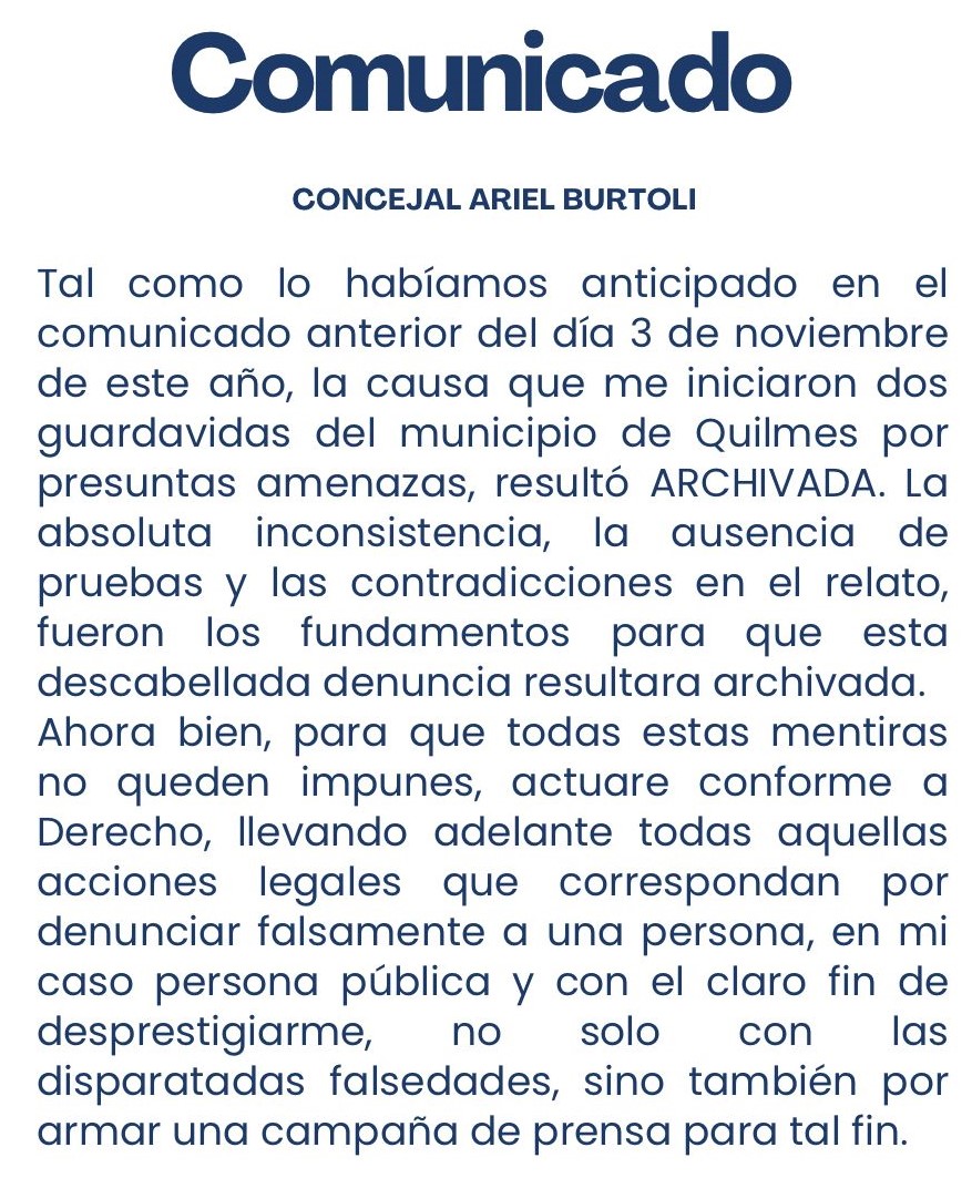 (CIQ) El concejal Ariel Burtoli ha visto desestimada la denuncia en su contra por parte de un grupo de Guardavidas, de la que este medio -entre otros- se había hecho eco a principios de mes.