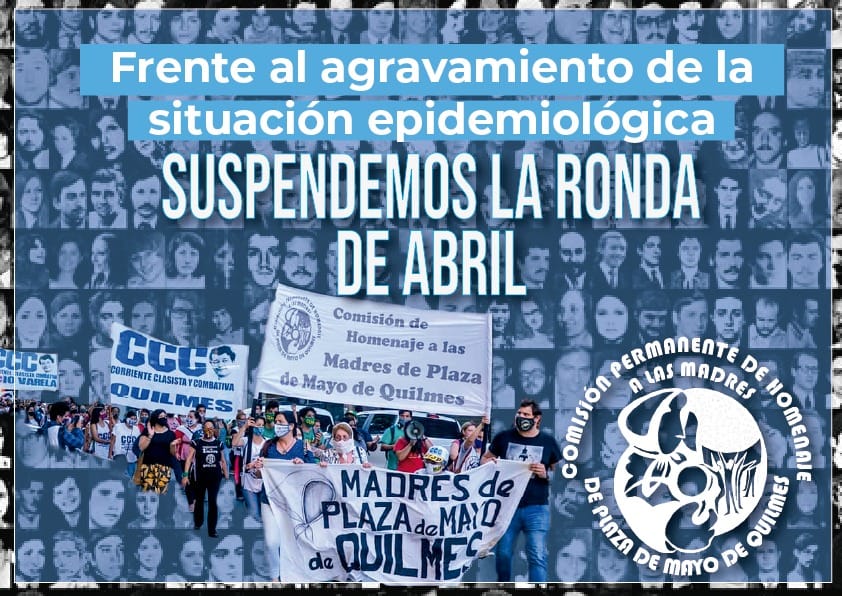 Frente a la agravada situación epidemiológica que enfrentamos; el considerable aumento de casos que obligó al Gobierno Nacional a tomar medidas de prevención más estrictas para evitar la propagación del virus de Covid- 19 y sus nuevas cepas, que ya se encuentran en circulación, hemos decidido, con el objetivo de seguir cuidándonos y cuidar a compañeros y compañeras, suspender la ronda del mes de abril.