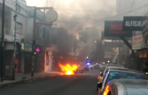 Una camioneta tipo utilitaria está ardiendo en Moreno y Alsina, en esta tarde de viernes. Comenzó el fuego minutos antes de las 19,30.