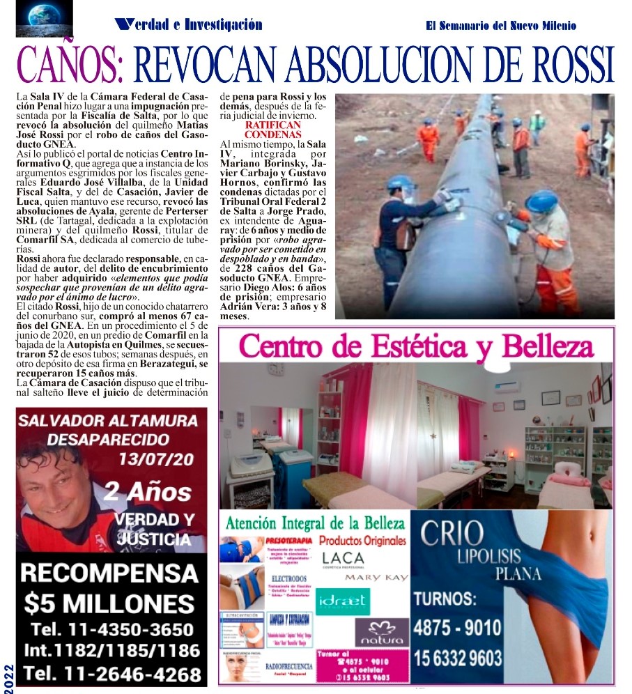 La Sala IV de la Cámara Federal de Casación Penal hizo lugar a una impugnación presentada por la Fiscalía de Salta, por lo que revocó la absolución del quilmeño Matías José Rossi por el robo de caños del Gasoducto GNEA.