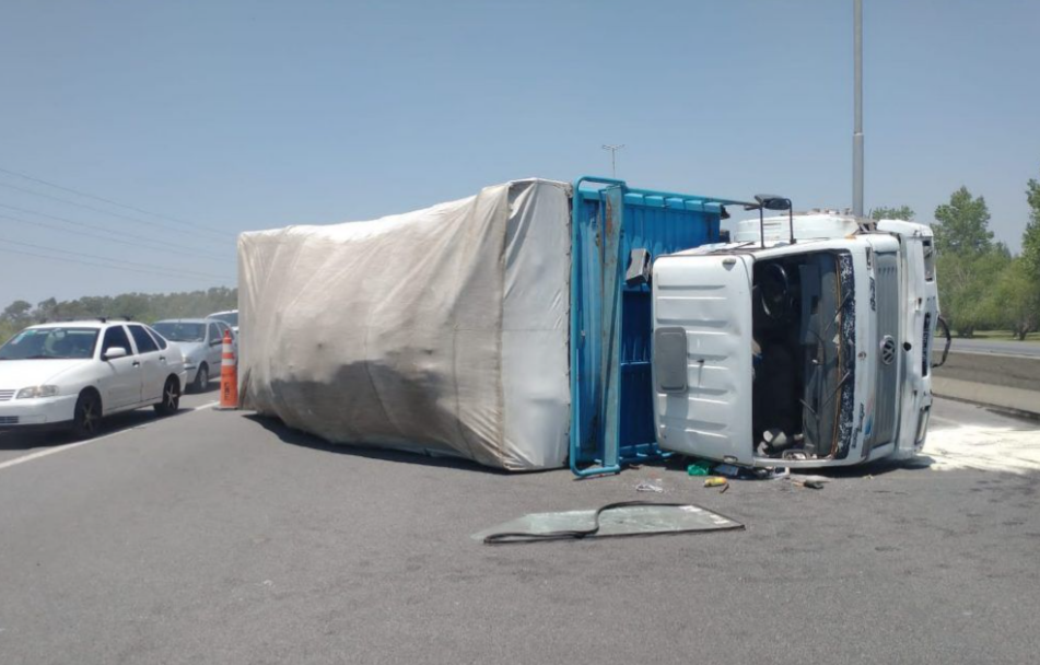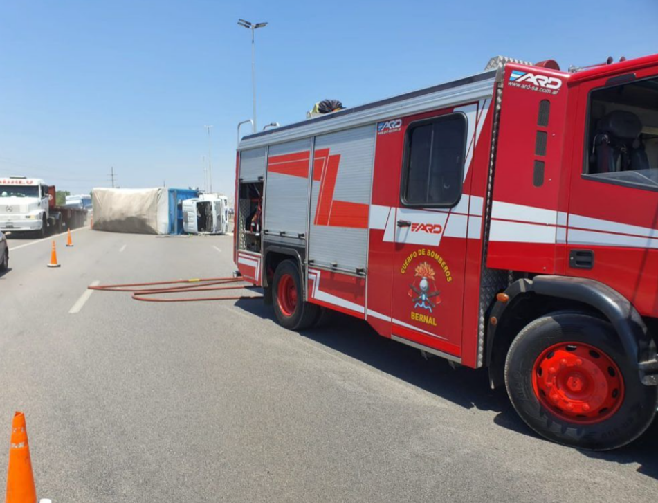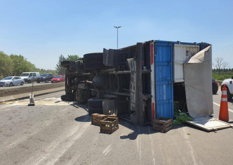 Poco después de las 13 volcó un camión en autopista, en sentido a capital, casi en la bajada de Bernal, accidente que no produjo lesiones importantes al conductor ni a terceros.