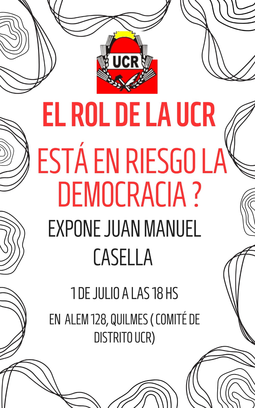 (CIQ) El dirigente Juan Manuel Casella (ex minsitro de Trabajo y precandidato a vicepresidente de la Nación) disertó en el Comité de Distrito quilmeño este 1 de julio para referirse al rol de la Unión Cívica Radical en el actual contexto político en el que se preguntaron si está en riesgo la democracia. La sola enunciación de la pregunta da cuenta de los temores que vislumbran los correligionarios del centenario partido.