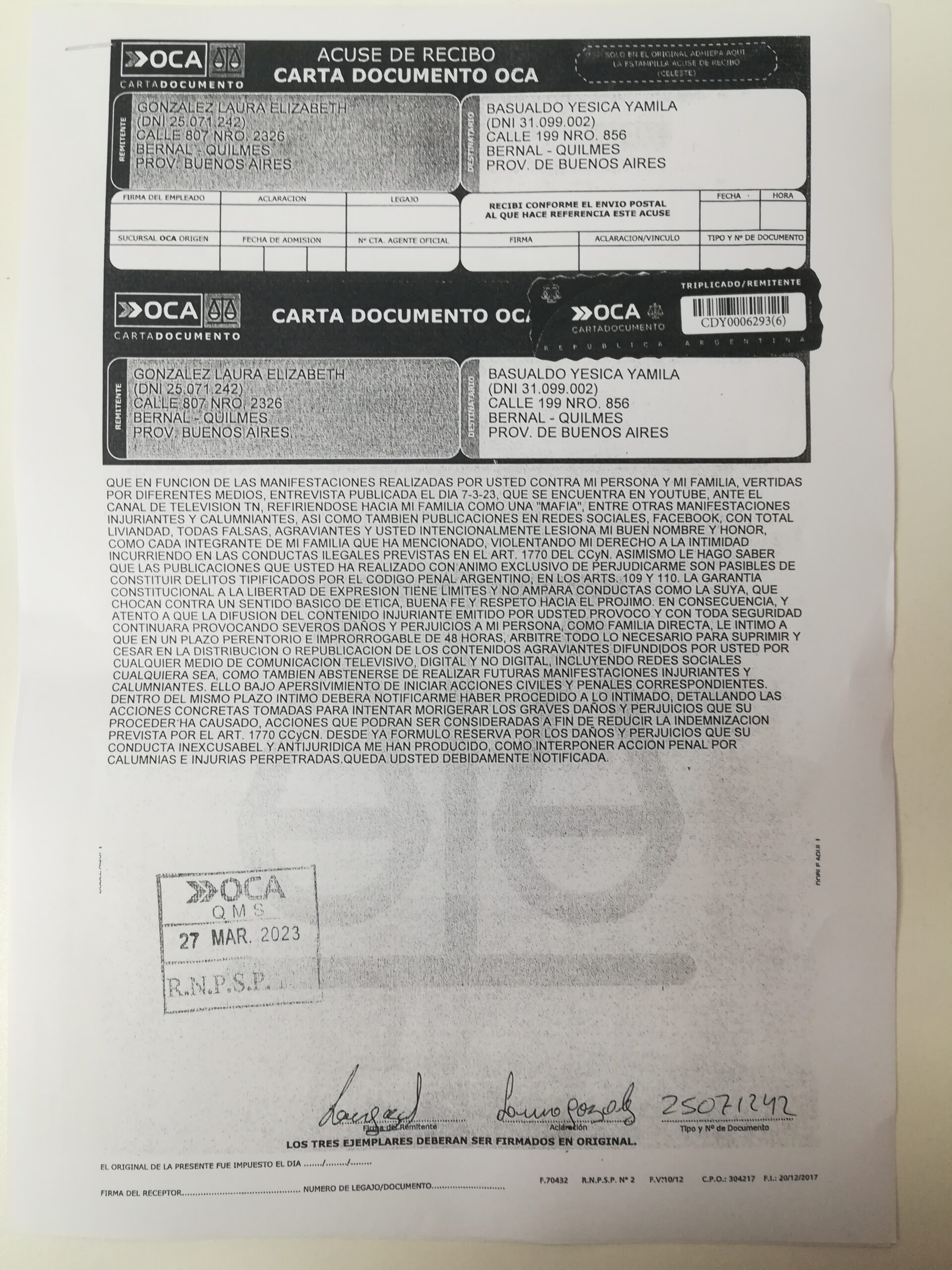 Entregaron a este CIQ copias de sus presentaciones a los padres de León, por difamación, y ante el Poder Judicial.