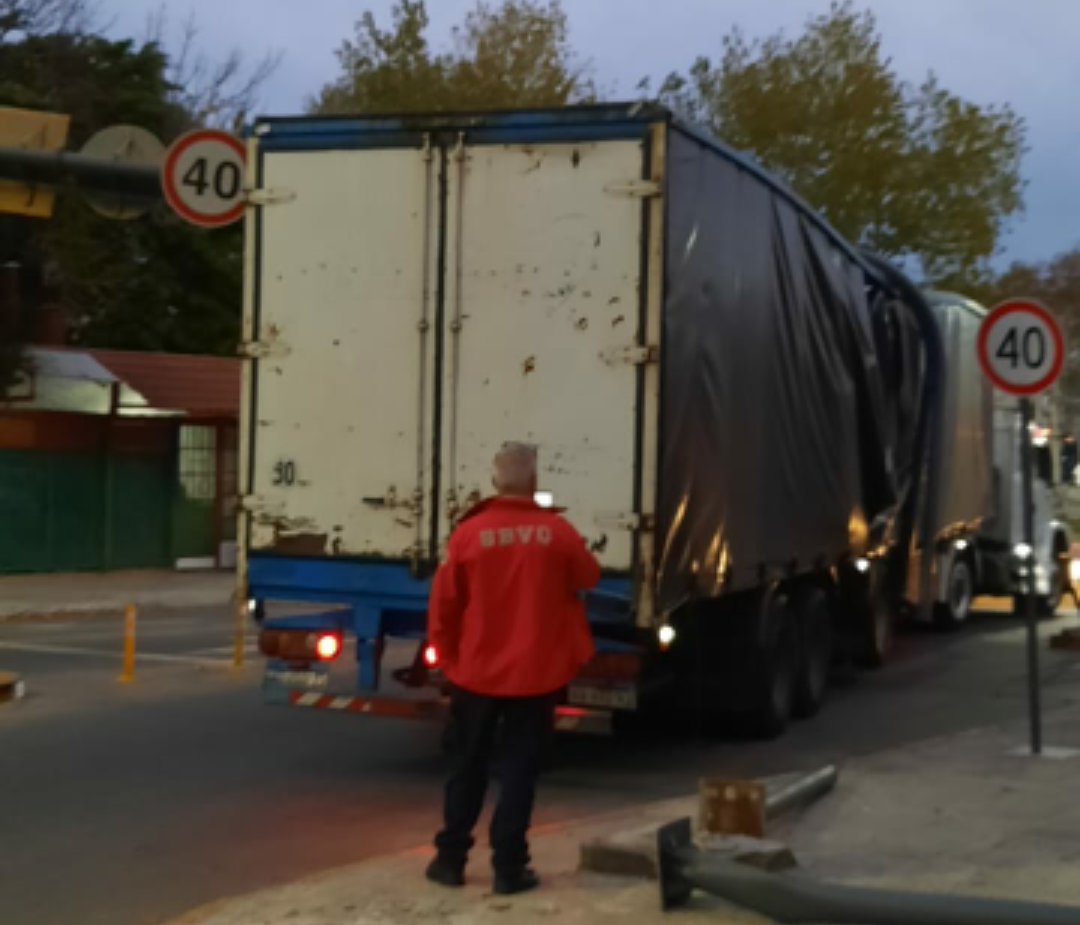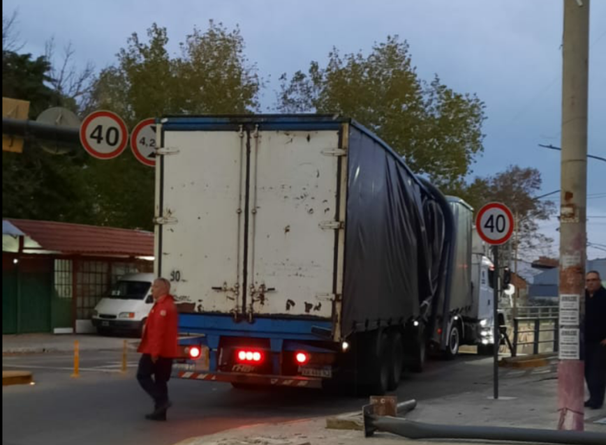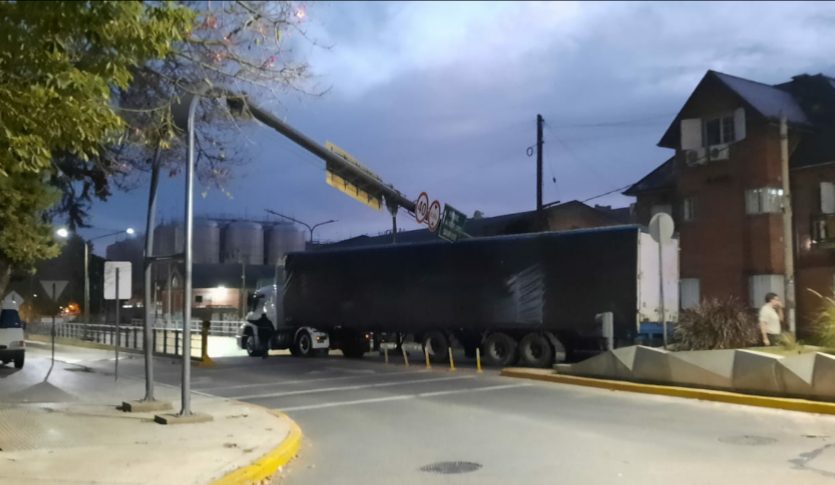 En las fotos se aprecia cómo la columna quedó abrazando la parte media de la caja del camión. No se produjeron victimas, la zona se encuentra restringida al tránsito.