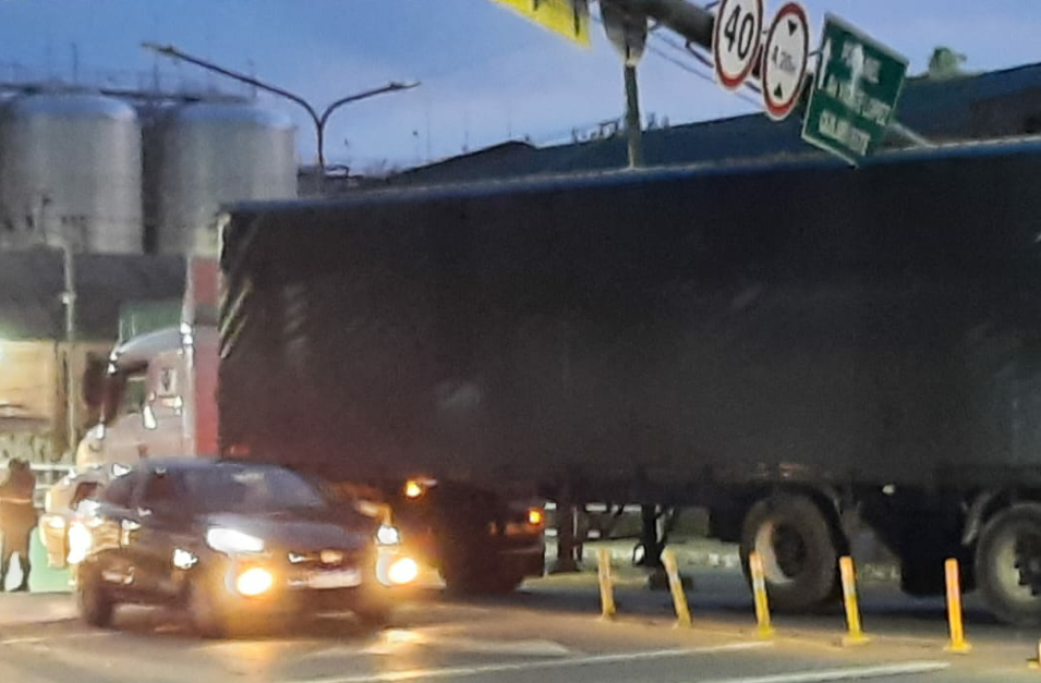 Un camión de transporte de la Cervecería, esta tarde de miércoles, se llevó por delante los carteles de señalización del bajovías de Guido, hacia Amoedo.
