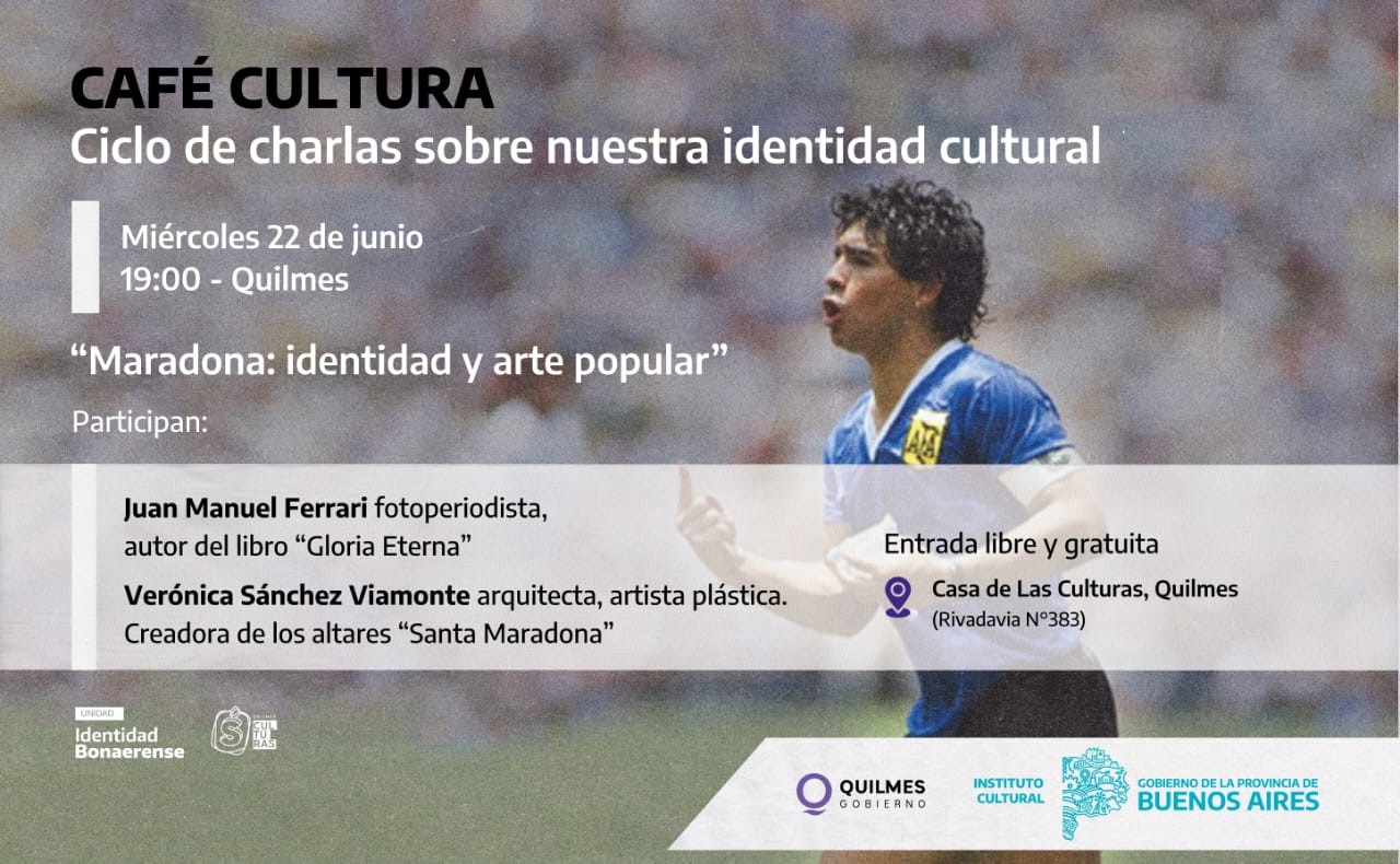 El miércoles 22 de junio a las 19, se realizará una nueva edición del ciclo Café Cultura, en la Casa de las Culturas, (Rivadavia 383), en Quilmes Centro, bajo la temática Maradona: Identidad y Arte Popular.