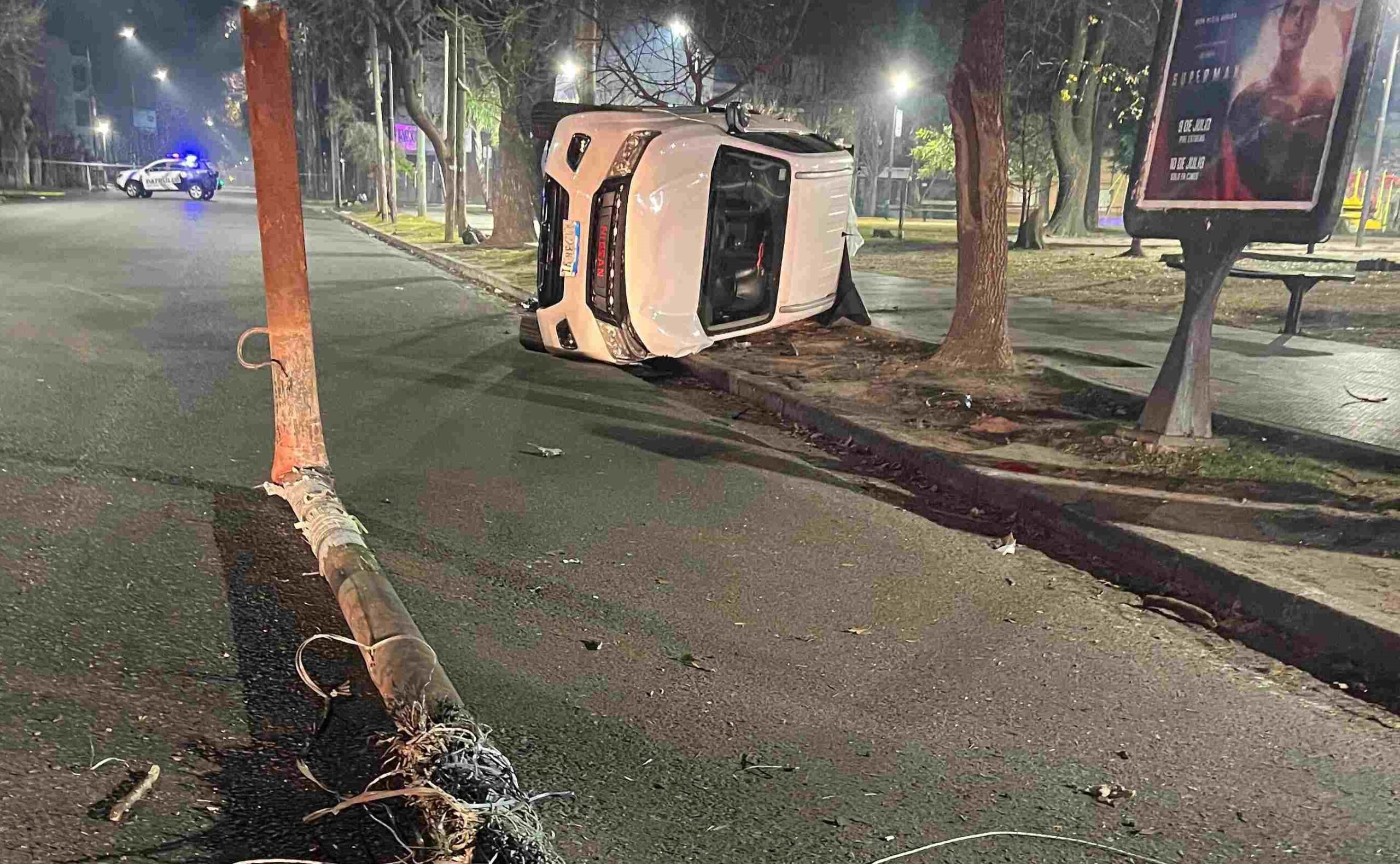 En esta medianoche, dos vehículos chocaron en Vicente López y Pellegrini, por lo que una Nissan blanca terminó volcada sobre la plaza Aristóbulo del Valle. Una persona herida debió ser asistida en el lugar por personal del SAME.