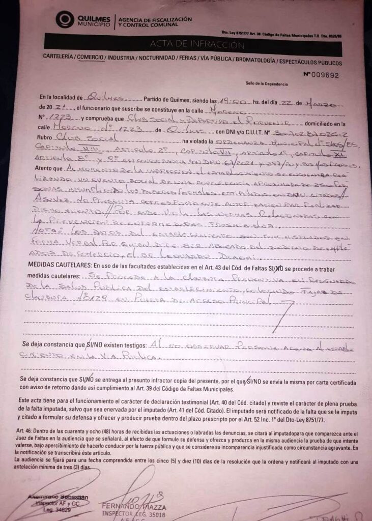 Una comisión de inspectores municipales al mando de la secretaria de la Agencia de Fiscalización y Control Comunal (AFyCC), Alejandra Cordeiro se presentó en el Club El Porvenir, de Moreno y Primera Junta, para su clausura con el argumento de que no cumplían el protocolo para evitar el contagio del COVID.