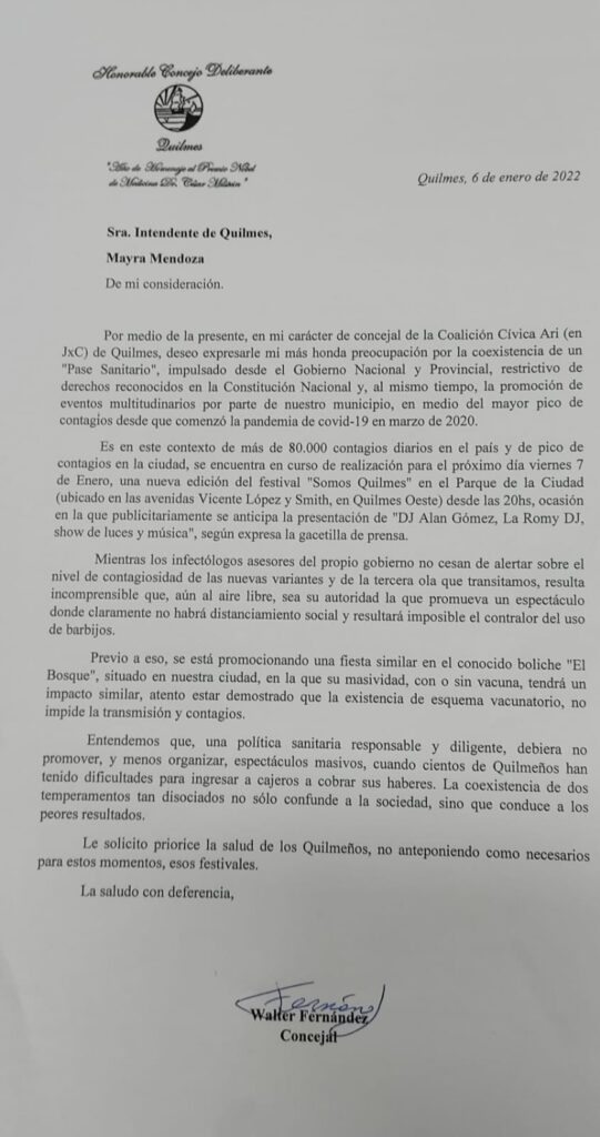 La nota presentada por Fernandez comienza diciendo: “Deseo expresarle mi más honda preocupación por la coexistencia de un «Pase Sanitario», impulsado desde el Gobierno Nacional y Provincial, restrictivo de derechos reconocidos en la Constitución Nacional y, al mismo tiempo, la promoción de eventos multitudinarios por parte de nuestro municipio, en medio del mayor pico de contagios desde que comenzó la pandemia de covid / 19 en marzo de 2020.”