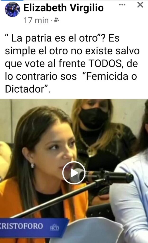 Me duele que a esta altura de la democracia las palabras de Evelin Giancristoforo sólo sirvan para derrumbar puentes, me preocupa la incapacidad de entender que las mujeres hacemos política además desde un lugar muy diferente, no me van ni un poco los absolutismos ni los ecos discursivos autocráticos… ¿En dónde quedó pues “la patria es el otro”? Es simple, el otro no existe salvo que vote al Frente de Todos, de lo contrario es “Femicida o Dictador”.