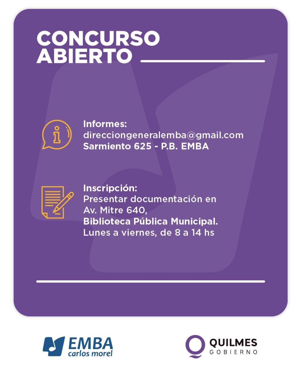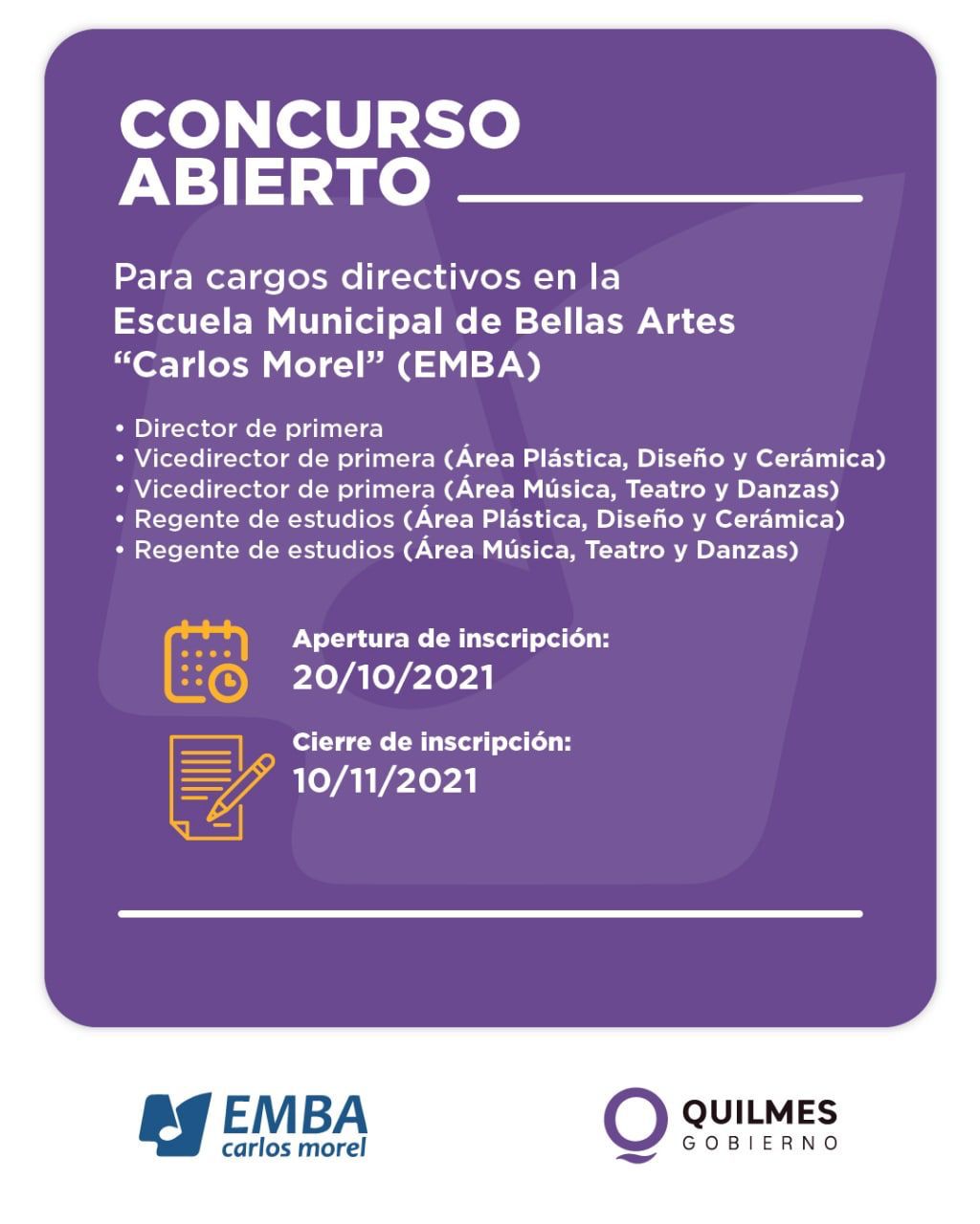 El Municipio de Quilmes llama a concurso abierto de antecedentes y oposición para cubrir los siguientes cargos directivos en la Escuela Municipal de Bellas Artes Carlos Morel (EMBA).