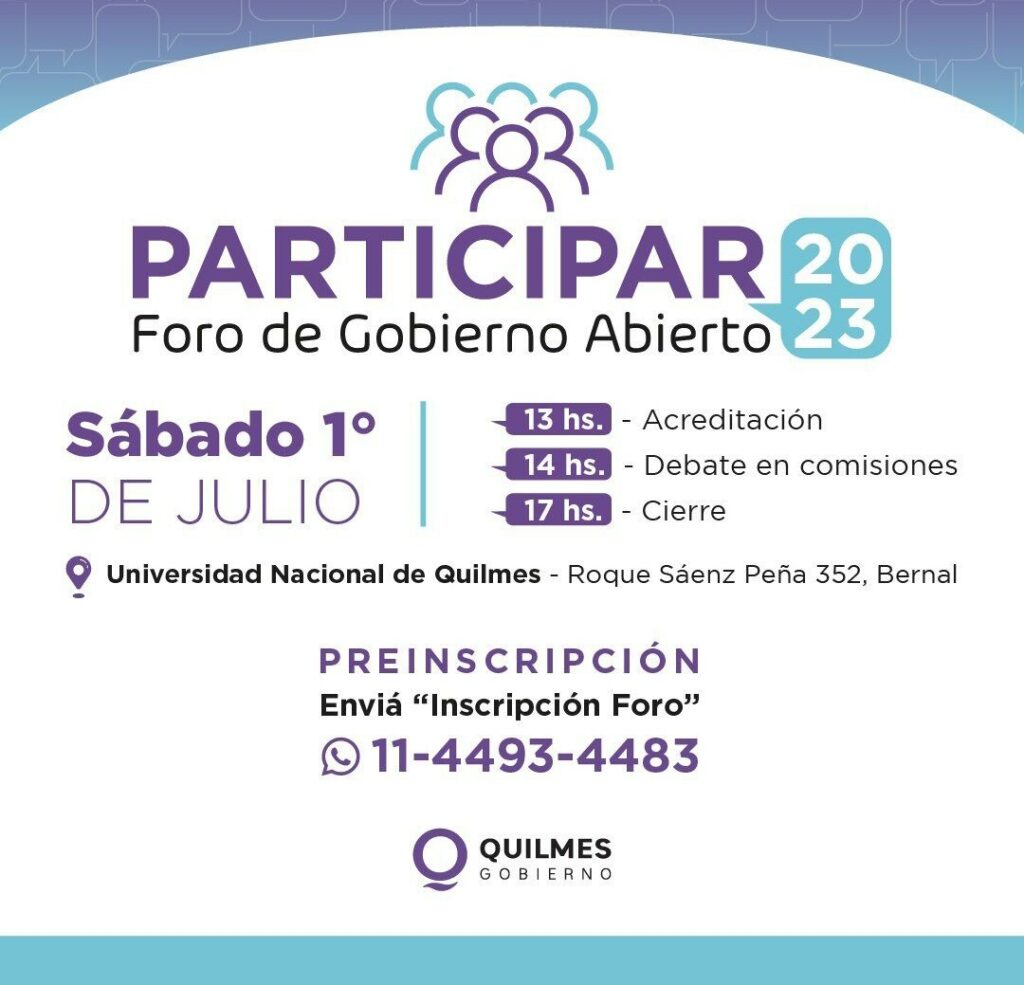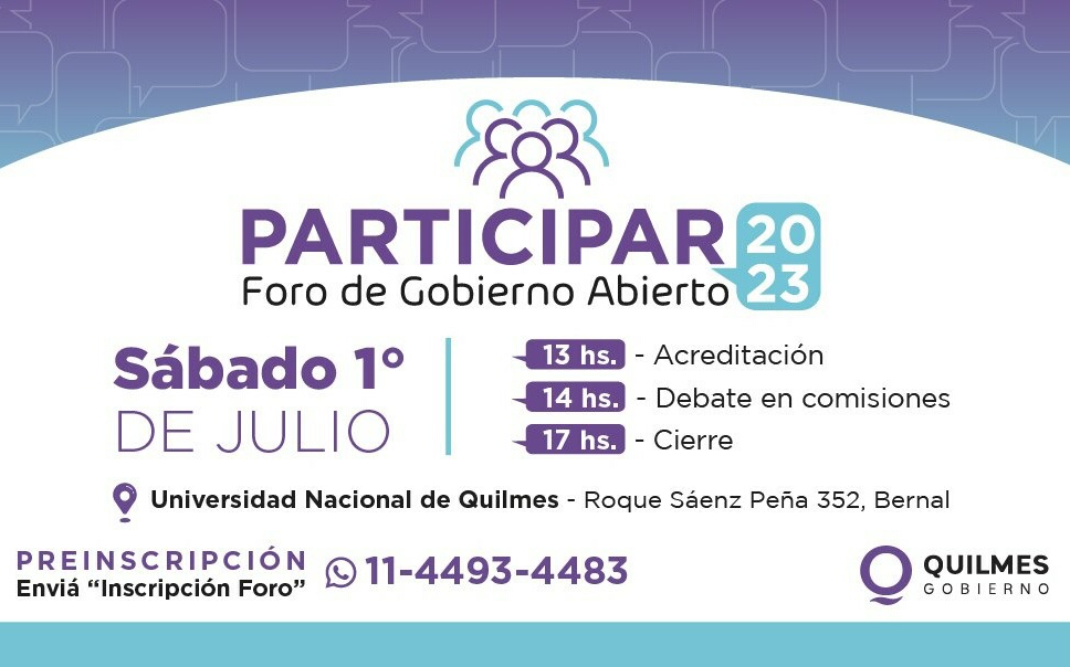 El Municipio lanza este 1 de julio en la Universidad Nacional, en Bernal, el «Foro de Gobierno Abierto», que tiene como objetivo dos pilares fundamentales: la participación ciudadana, para que los y las ciudadanas puedan involucrarse en la cuestión pública y propongan mejoras para el distrito, y la transparencia de la gestión, para que los vecinos accedan a la información clave y tengan un verdadero control del uso eficiente de los recursos del Estado. Se desarrollará durante la tarde y contará con distintas comisiones referidas a las diferentes áreas de gobierno. Tendrá la presencia de secretarios del Municipio acompañados por funcionarios, concejales y vecinos. Durante el evento también se hará la apertura de votación del nombre de la nueva Estación Quilmes Sur de la Línea Roca, habrá un stand de tarjeta de beneficios Somos Quilmes y una Feria de Emprendedores.