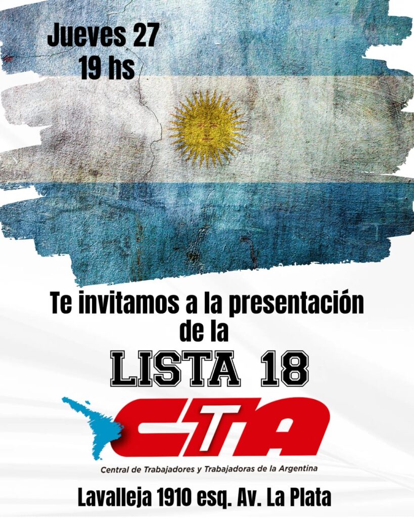 En la tarde de este jueves se presentará la Lista 18 que le disputará la conducción al actual oficialismo de la Central de Trabajadores Argentinos (CTA) de los Trabajadores. Esta es la lista que encabezan Emilia Martínez y Eva Ruiz Díaz.