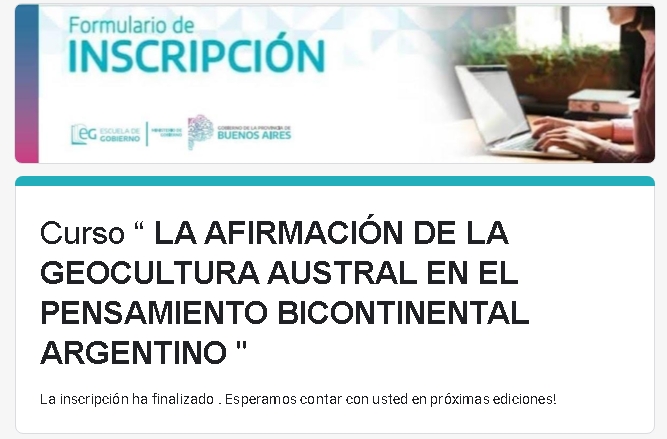 Este miércoles 18 comenzará el curso “La afirmación de la geocultura austral en el pensamiento bicontinental argentino”, a cargo del doctor Ariel Hartlich. Está organizado en dos clases virtuales sincrónicas, dictadas de 10 a 12 de forma abierta y gratuita como parte de las propuestas formativas de la Escuela de Gobierno de la Provincia.