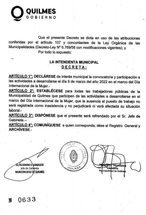 Como era de esperarse, el 8 de marzo, la Jefa comunal de Quilmes, Mayra Mendoza, firmó el Decreto en el cual otorga asueto a las trabajadoras municipales del distrito.