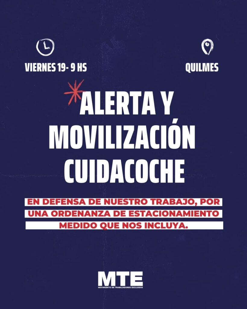 Desde el MTE Quilmes convocamos a movilizar este viernes 19 a las 10 hs al Concejo Deliberante para defender el trabajo de los cuidacoches. Rechazamos una ordenanza que privatiza el estacionamiento y otros servicios de tránsito, pensada para una empresa privada, que no genera empleo y se queda con un impuesto que pagan los vecinos. Hace más de 5 años proponemos un Estacionamiento Medido con Inclusión Social: trabajo con derechos, ordenamiento del espacio público y recursos para la salud pública. Este proyecto se armó sin consulta, a puertas cerradas, y quieren votarlo de forma express.