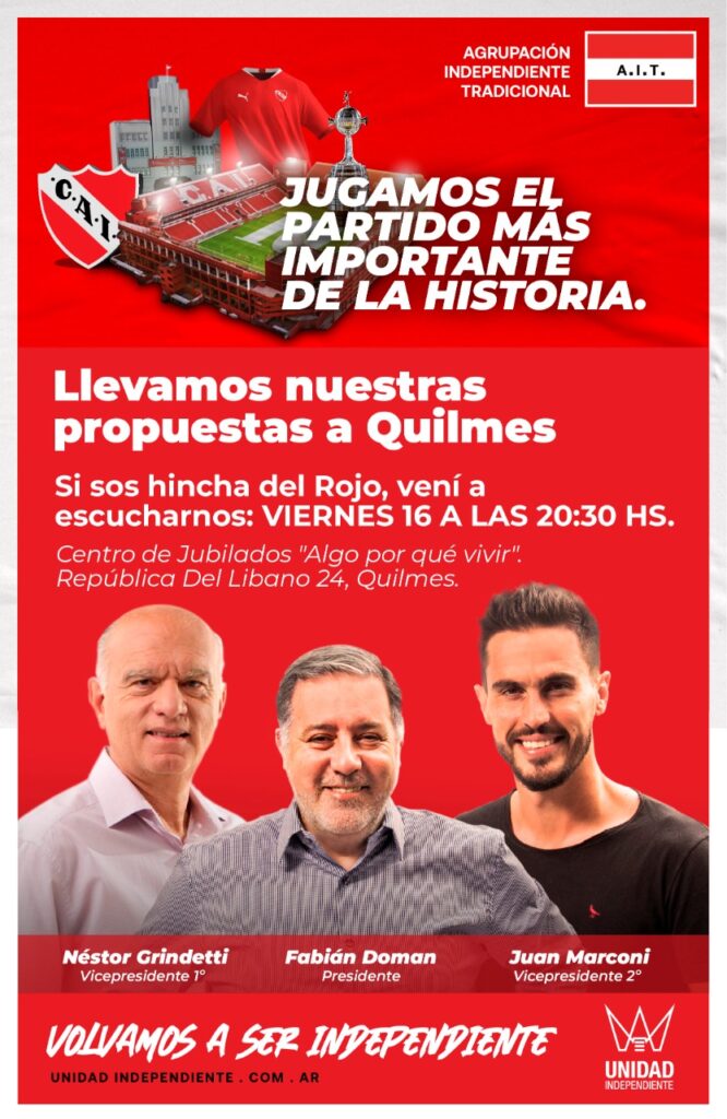 Venimos a mirar para adelante, sabiendo lo que hay que hacer; tenemos que ordenar institucional, económica y deportivamente a Independiente. Ese es el eje principal y el desafío que nos proponemos como agrupación.