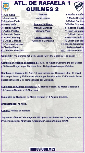 Cambios en Quilmes ST: 28m, 18-Colman por González; 39m, 15-Drocco por López y 16-Moreno por Bonetto; 47m, 13-Evangelista por Erquiaga y 17-Blanco por Molina.