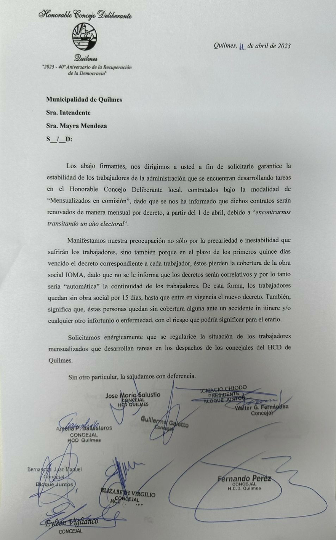 Ediles de la oposición reclamaron a la intendente Mayra Mendoza que se avenga a regularizar la situación de los trabajadores de los concejales del bloque Juntos por el Cambio, quienes en estos meses previos al acto electoral deberán renovar cada mes sus contratos, como modo de ejercer presión a los ediles para quienes trabajan.