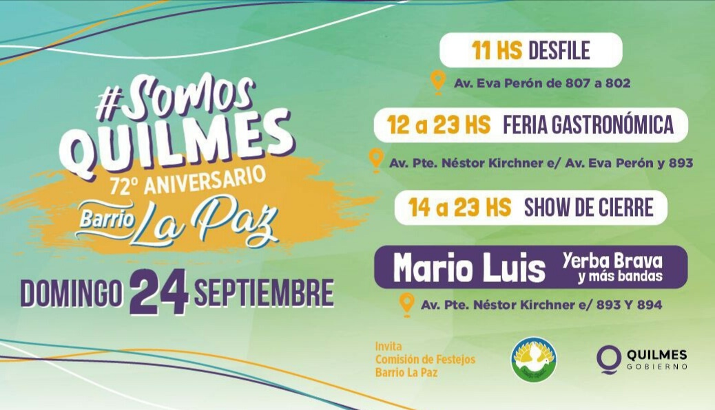 El Municipio invita a los vecinos a ser parte del festejo por el 72º aniversario del barrio La Paz, que se realizará el domingo 24 de septiembre, desde las 11 y hasta las 23. Contará con desfile cívico tradicionalista, una feria gastronómica, y en el marco de una nueva edición del festival Somos Quilmes, espectáculos musicales de bandas locales, y el cierre estelar a pura cumbia con las actuaciones de Yerba Brava y Mario Luis.