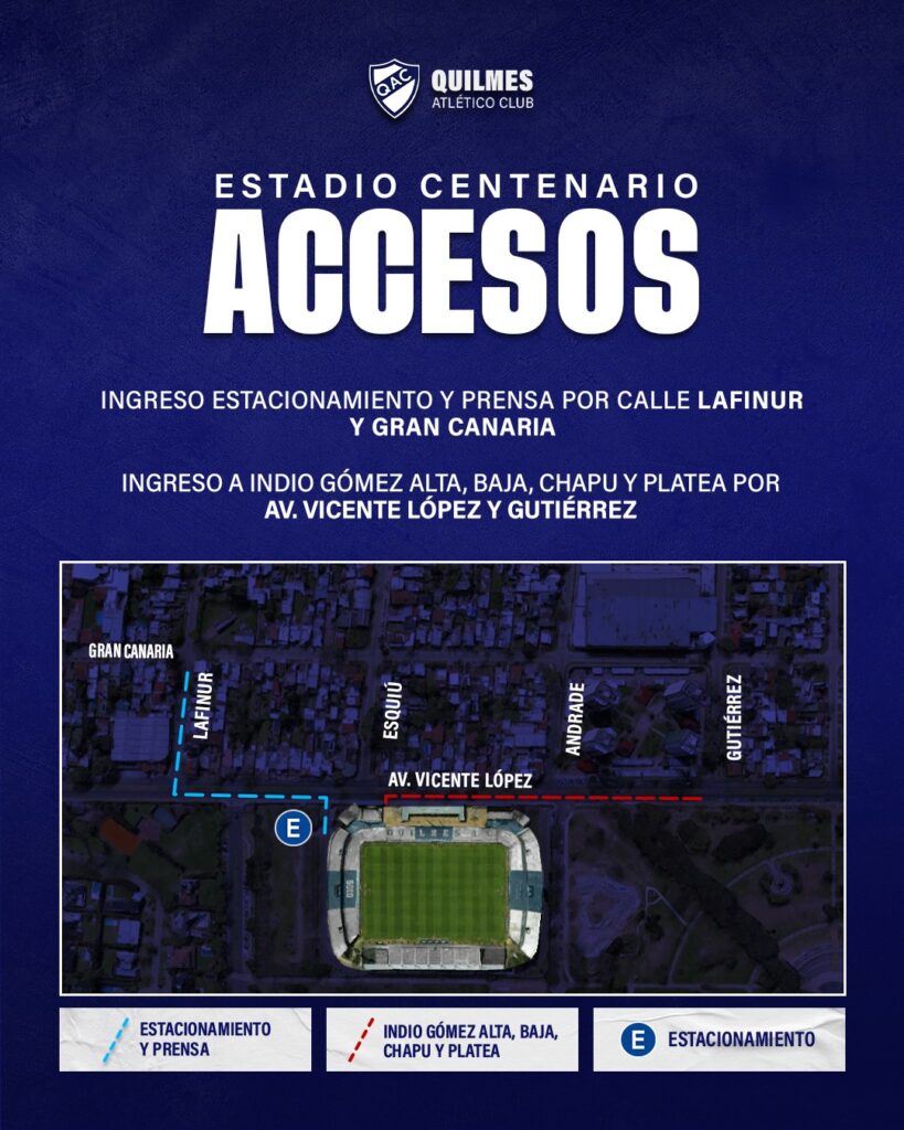 Para el encuentro de hoy, el público no podrá ingresar desde el Boulevard Indio Gomez por el norte. Por disposición de la Municipalidad de Quilmes y por el evento «Parque de Juegos», los socios del club deberán ingresar por la esquina de Gutiérrez y Gomez y acceder por las mismas puertas de siempre. En el caso de los vehículos, deberán ingresar por Lafinur y entrar al estacionamiento por la habitual puerta 1.