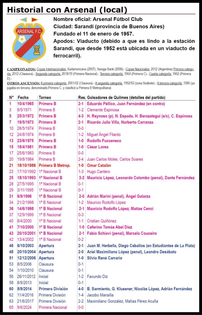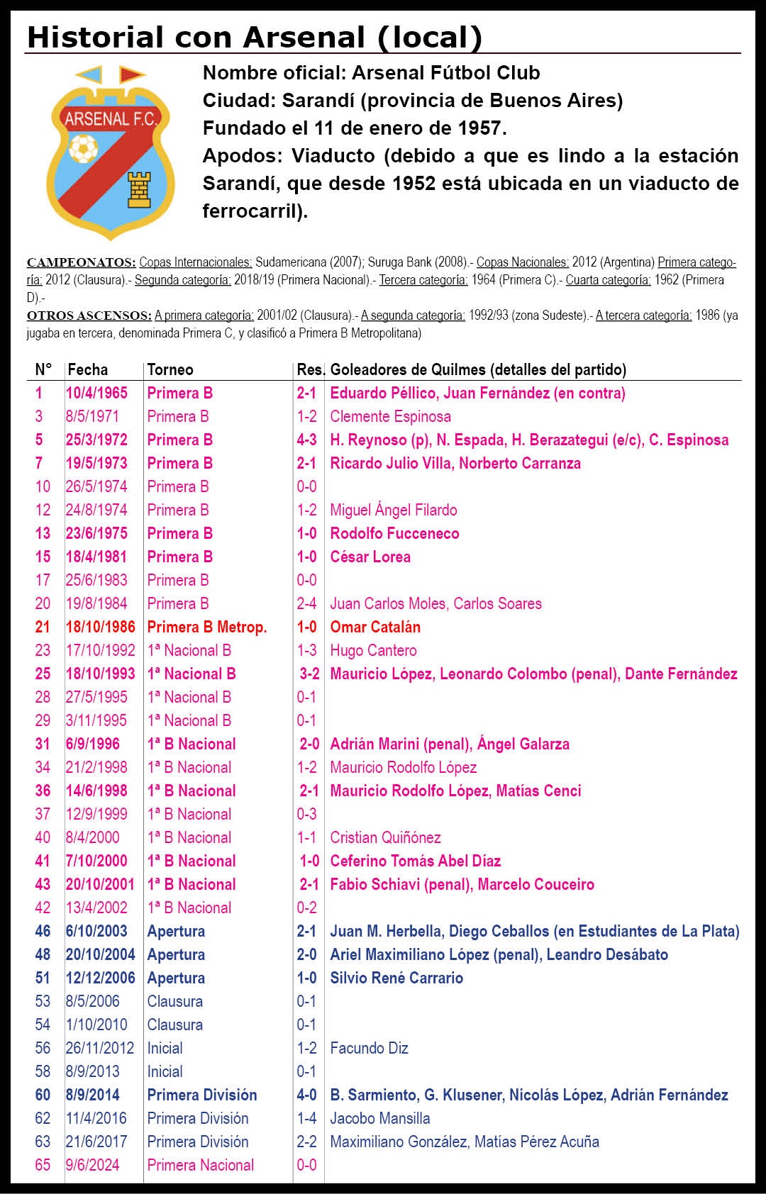 En total, el Cervecero y los del Viaducto se enfrentaron en 66 ocasiones (18 por la Primera División, 46 por la segunda categoría y dos por la Primera B Metropolitana). En 25 triunfó Quilmes, que marcó 75 tantos. Arsenal, en cambio, ganó 24 encuentros (y marcó 78 goles). Empataron 17 veces. El Decano lleva tres partidos sin perder frente a los celestes y rojos (dos empates y un triunfo). La última caída data del 5 de noviembre de 2018 en Sarandí por 1 a 4 (gol de Federico Anselmo).