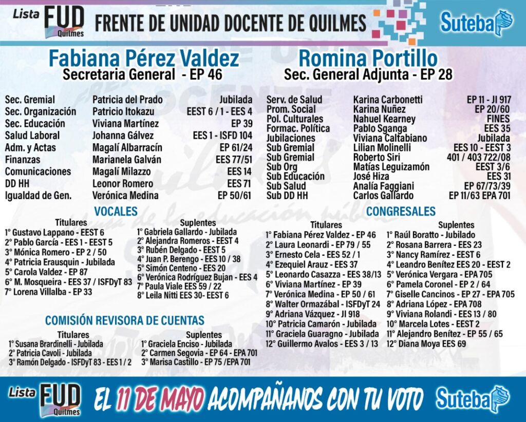 Este miércoles 11 de mayo, el gremio docente va a elecciones y ante la dispersión entre tres listas, el Frente de Unidad Docente Fud Quilmes confía en sus chances de generar un recambio en la conducción del Sindicato de Trabajadores de la Educación. Este viernes tuvieron su cierre de campaña.
