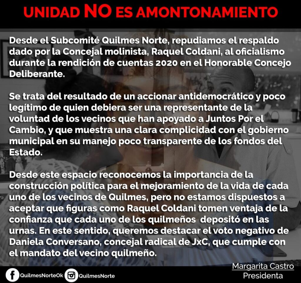 “Sabemos que estamos haciendo lo que corresponde, que podemos dar la cara y hablar de hechos. Elegimos cuidar a la gente, cuidar la vida, gracias al esfuerzo de nuestra Intendenta, Gobernador y Presidente Quilmes no colapsó, contamos con 11 postas de vacunación y casi 300 mil personas vacunadas. Lo que no tenemos que perder es el respeto ni la cordura dentro del recinto. Somos la cara del vecino, debemos mostrar respeto y demostrar que todos queremos un Quilmes mejor”.