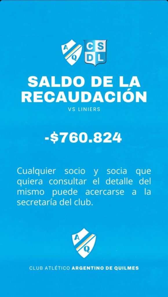 Desde las redes sociales del club dieron una muestra del saldo de recaudación del último encuentro disputado de local. Es una práctica que ya se hizo por primera vez el anterior encuentro en Alsina y Cevallos y parece hará cada vez que se juegue como local. Cada vez más son las instituciones que optan por mostrar estos datos a los socios e hinchas para que así puedan estar un poco más informados de la economía del club. Por lo tanto, el encuentro de local frente a Liniers dejó un saldo negativo de -$760.824. En el mismo comunicado dice que cualquier socio y socia que quiera más detalles del mismo puede acercarse a la secretaría.