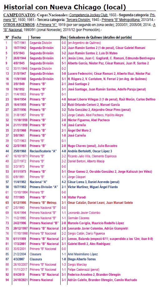 Quilmes recibe a Nueva Chicago en el Centenario, equipo con el que mantiene una considerable ventaja en la historia. Sobre 94 partidos, el Cervecero lleva 20 a su favor. Sin embargo, en la única vez que se enfrentó en duelo deeliminación directa pasaron los porteños: 0-1 en Mataderos y 0-0 en el Centenario en el reducido de la temporada 2000/01.